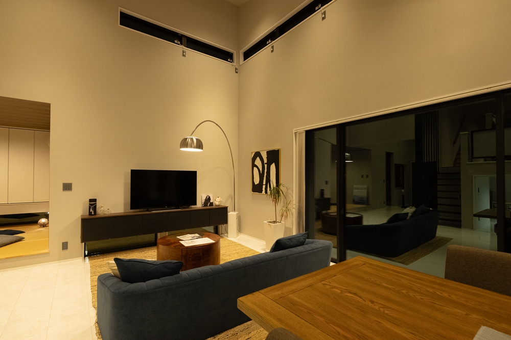 家の中心に位置する、開放的なLDK。5.8m高天井と大開口の窓が、外と内をつなぎ、光と風を心地よく取り込みます。