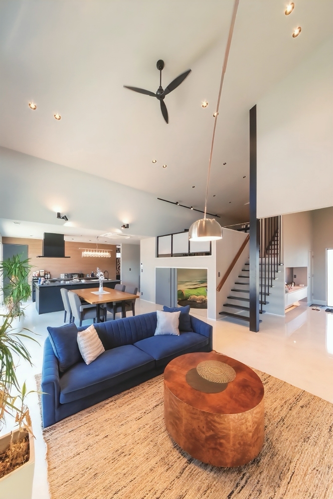 LDKはホテルのロビーのような雰囲気に。天井はもっとも高いところで5.8mあり、解放感抜群です。スキップフロアとロフトの3段構造になっており、立体的で奥行きのある間取りが空間の広がりを作っています。