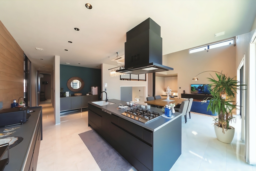 ホテルライクなアイランドキッチンを中心に、スキップフロアやロフトへと立体的につながるLDK。見た目のインパクトだけでなく、動線の良さも魅力です。